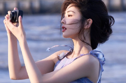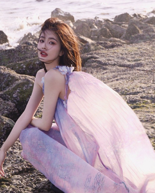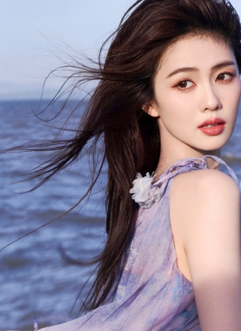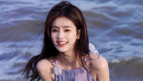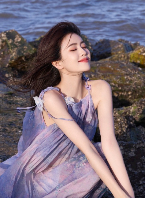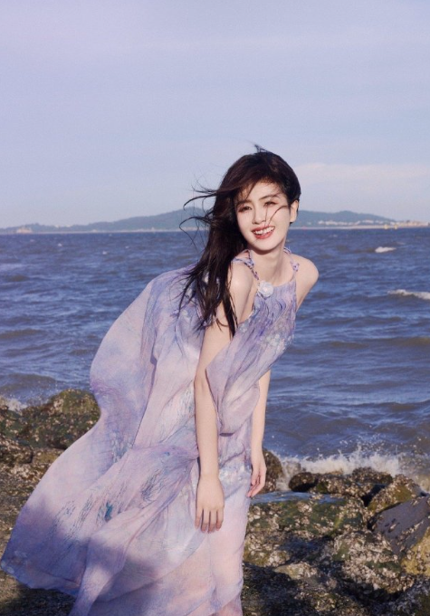 白鹿的海边紫色吊带裙大片,状态还是很可以的!